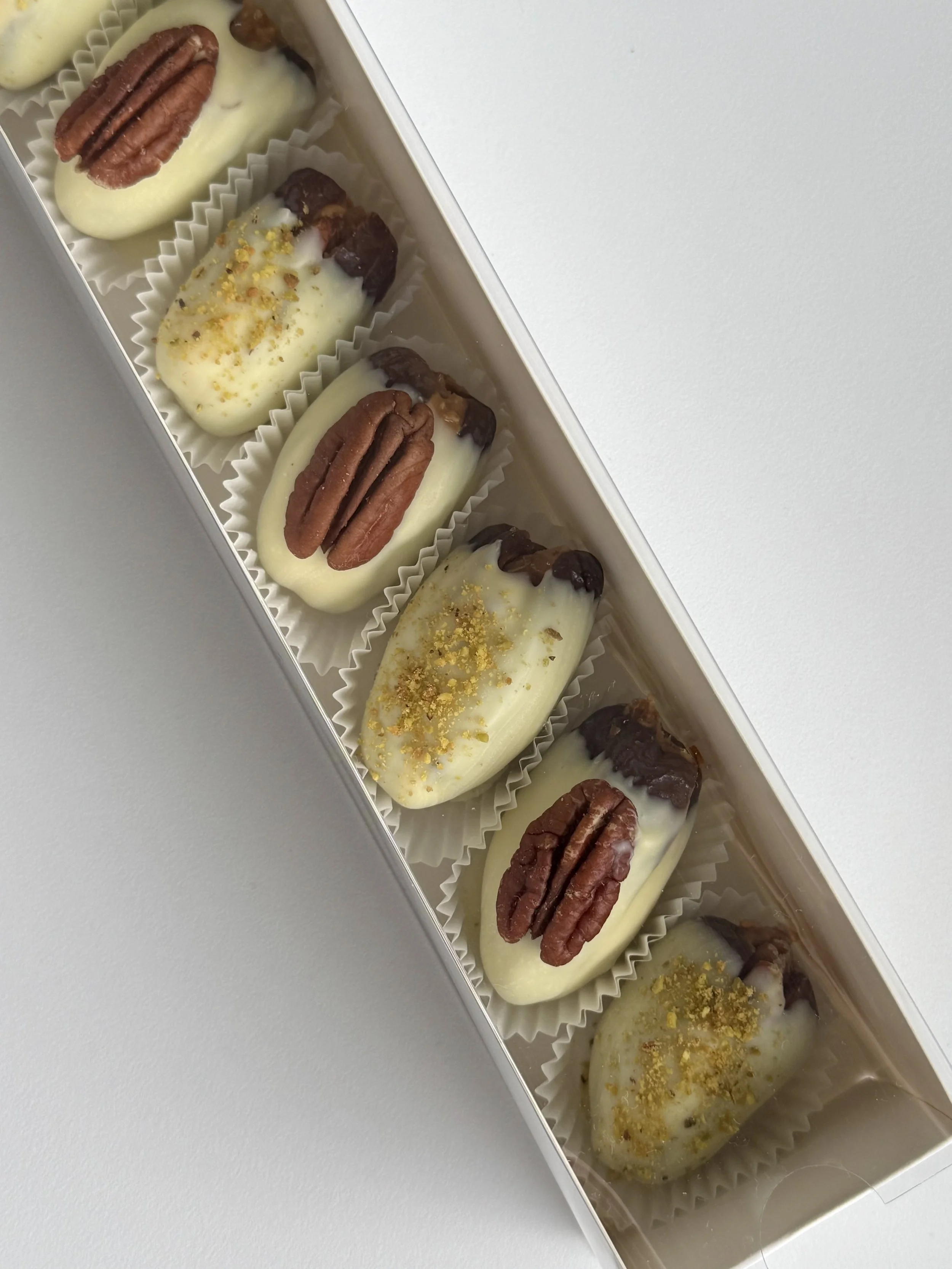 Säilytä herkkusi jääkaapissa, jotta ne maistuvat parhaimmalta. Marjat ovat parhaimmillaan tuoreina – 24 tunnin kuluessa. Suklaalla ja pähkinöillä täytetyt taatelit säilyvät jopa 2 viikkoa.